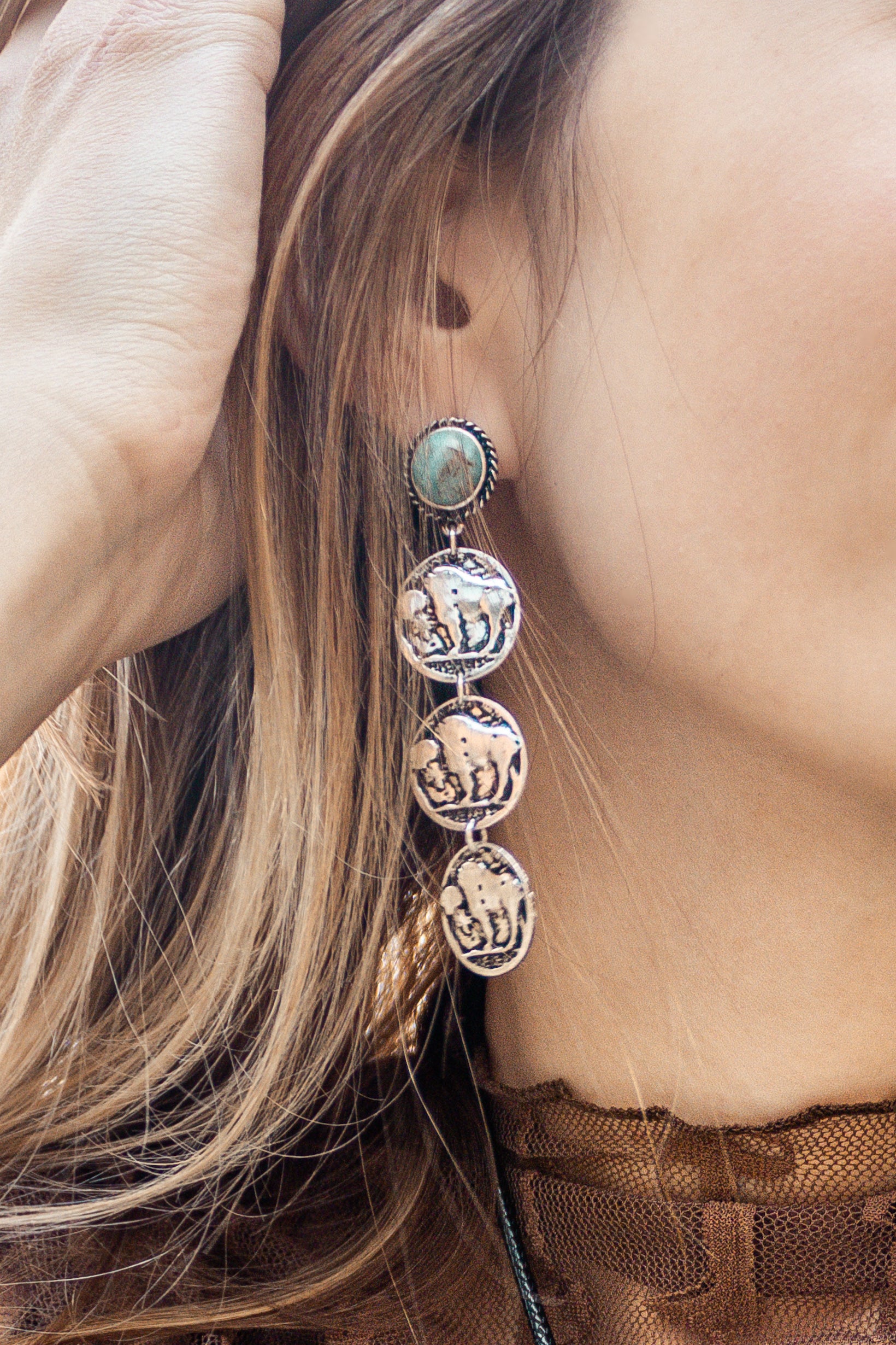Timeless as the plains they’re named for, the Cimarron Earrings capture the heart of the western frontier. Featuring turquoise stones set above cascading silver coin-style charms, they blend rustic spirit with refined cowgirl style.