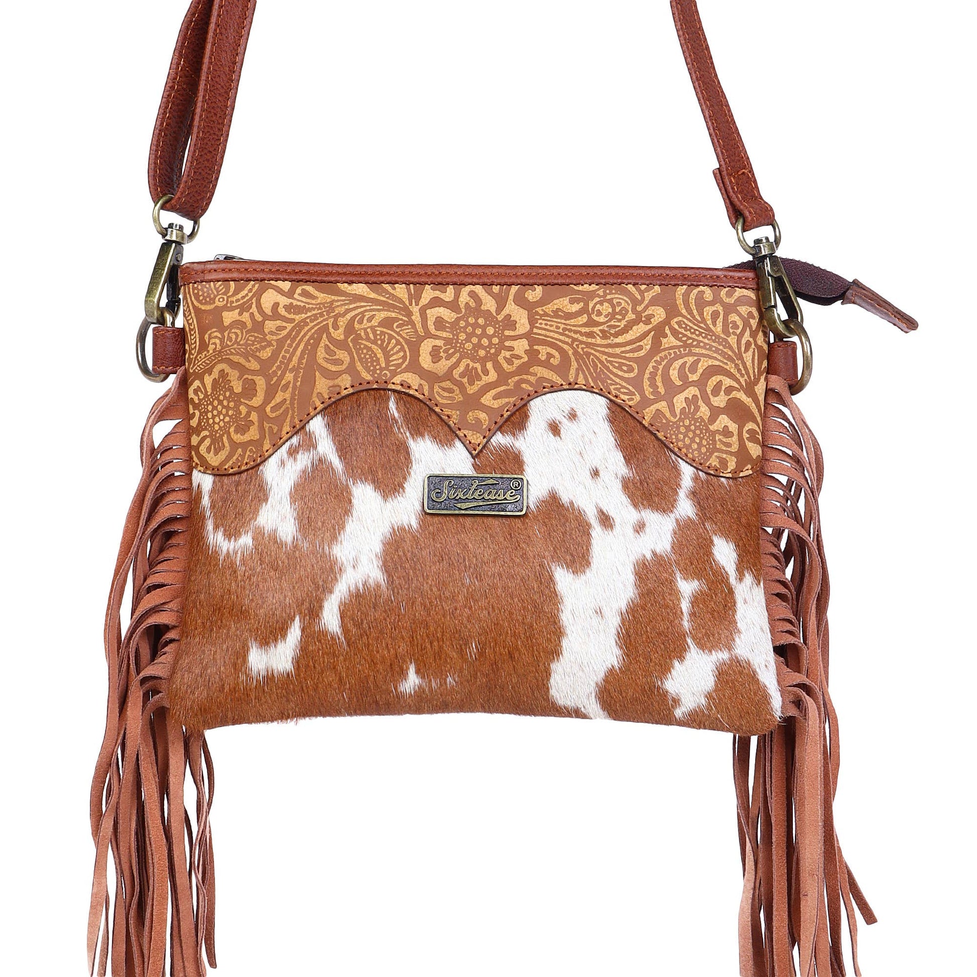 Carry Western charm everywhere you go with our Cowhide Fringe Crossbody Sling. Crafted from genuine leather and hair-on hide, this effortless everyday bag blends boho flair with true ranch-style character. Long suede fringe, floral detailing, and a comfortable adjustable strap make it the perfect statement piece for festivals, errands, rodeo nights, or casual outings.