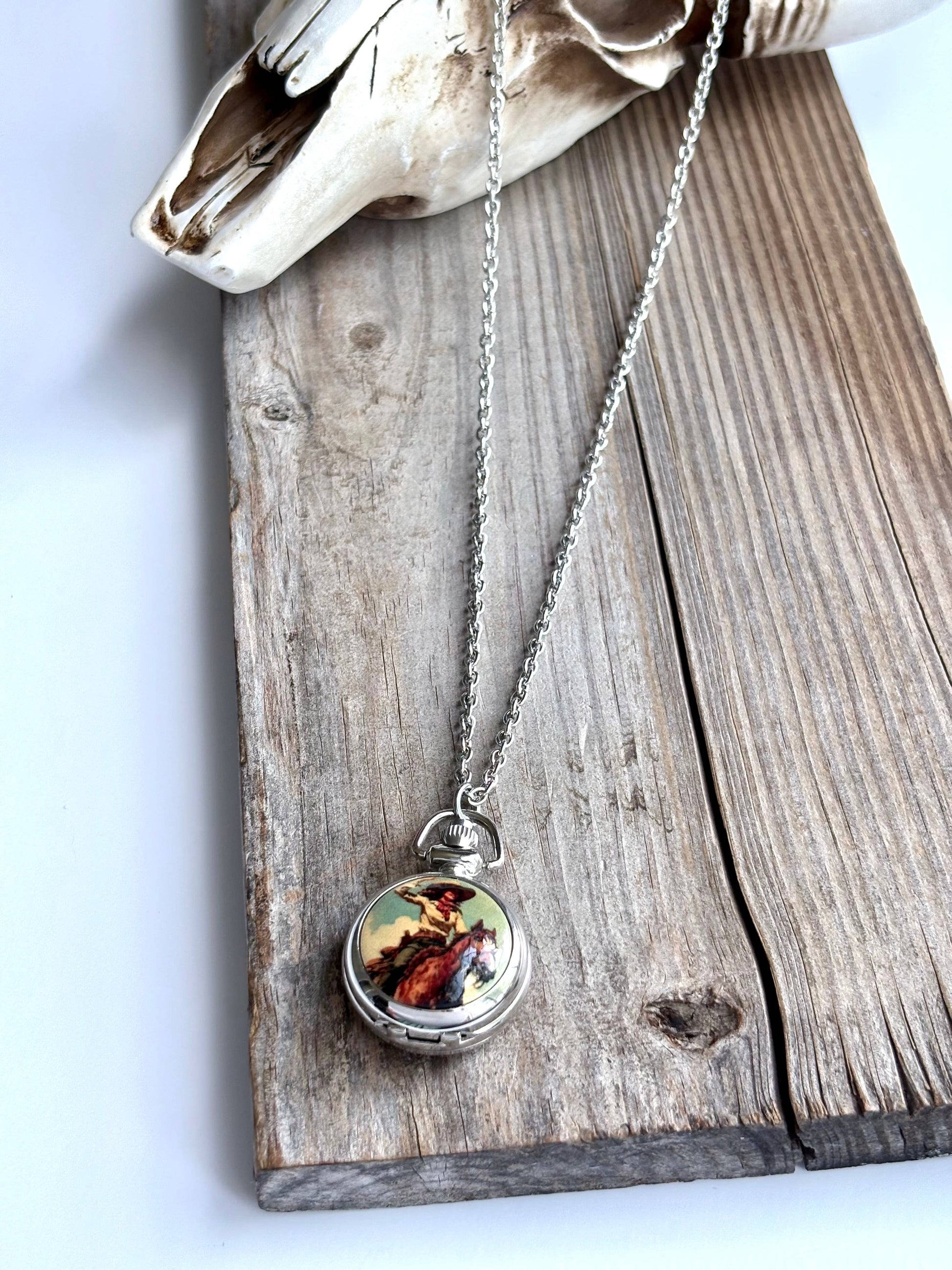 Western Printed Cowgirl Quarts Pocket Watch w/ Mirror Pendant Necklace