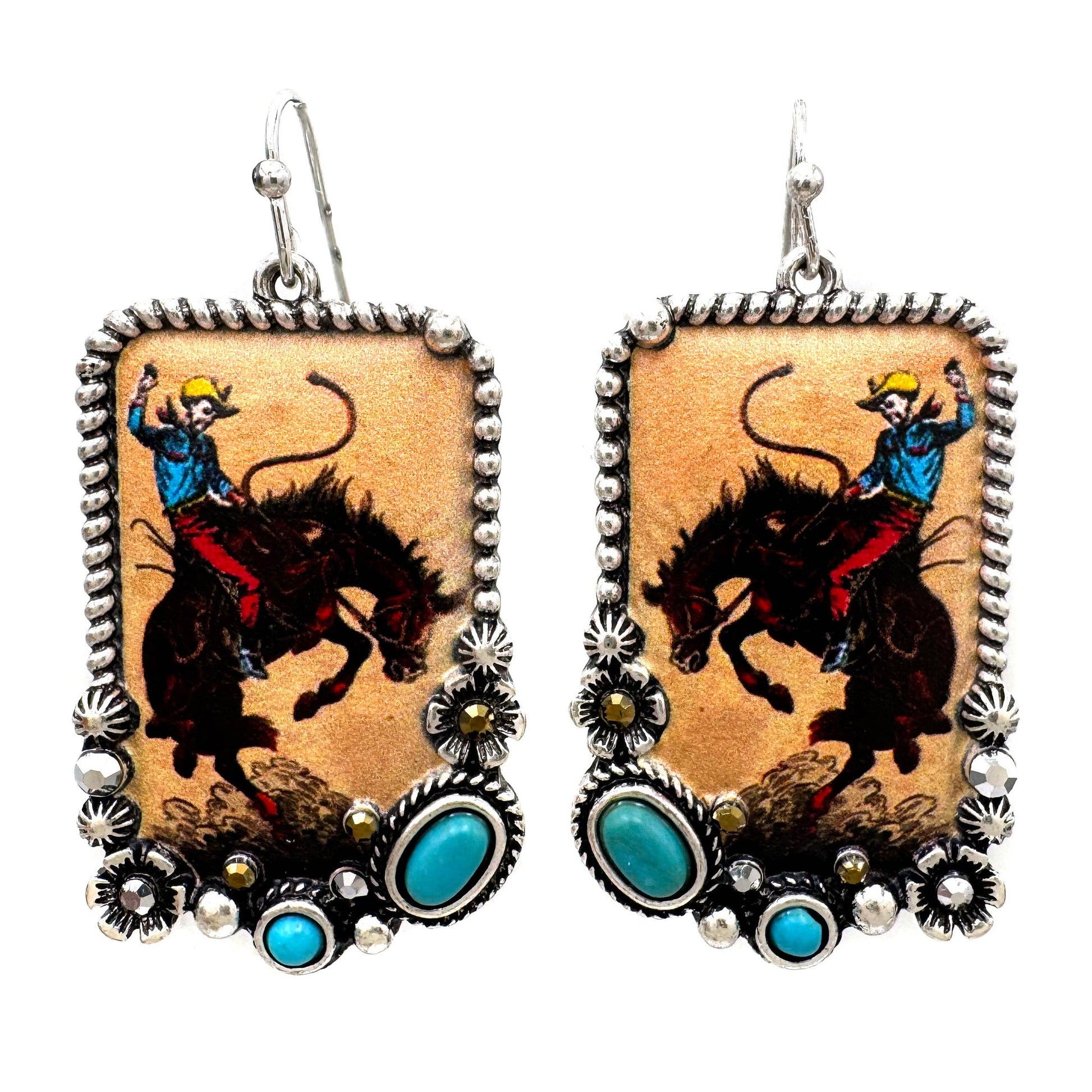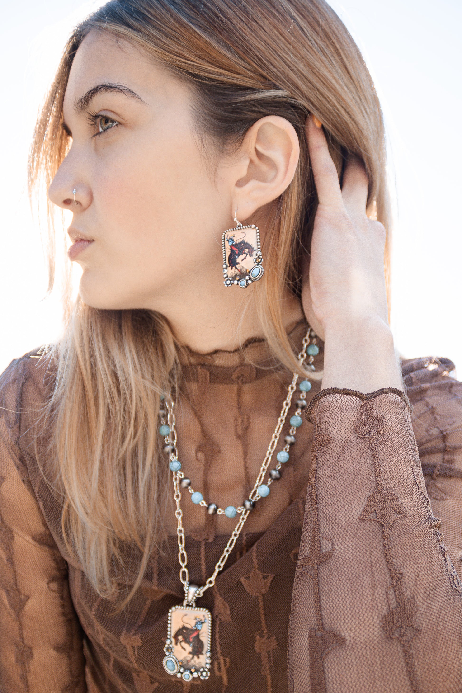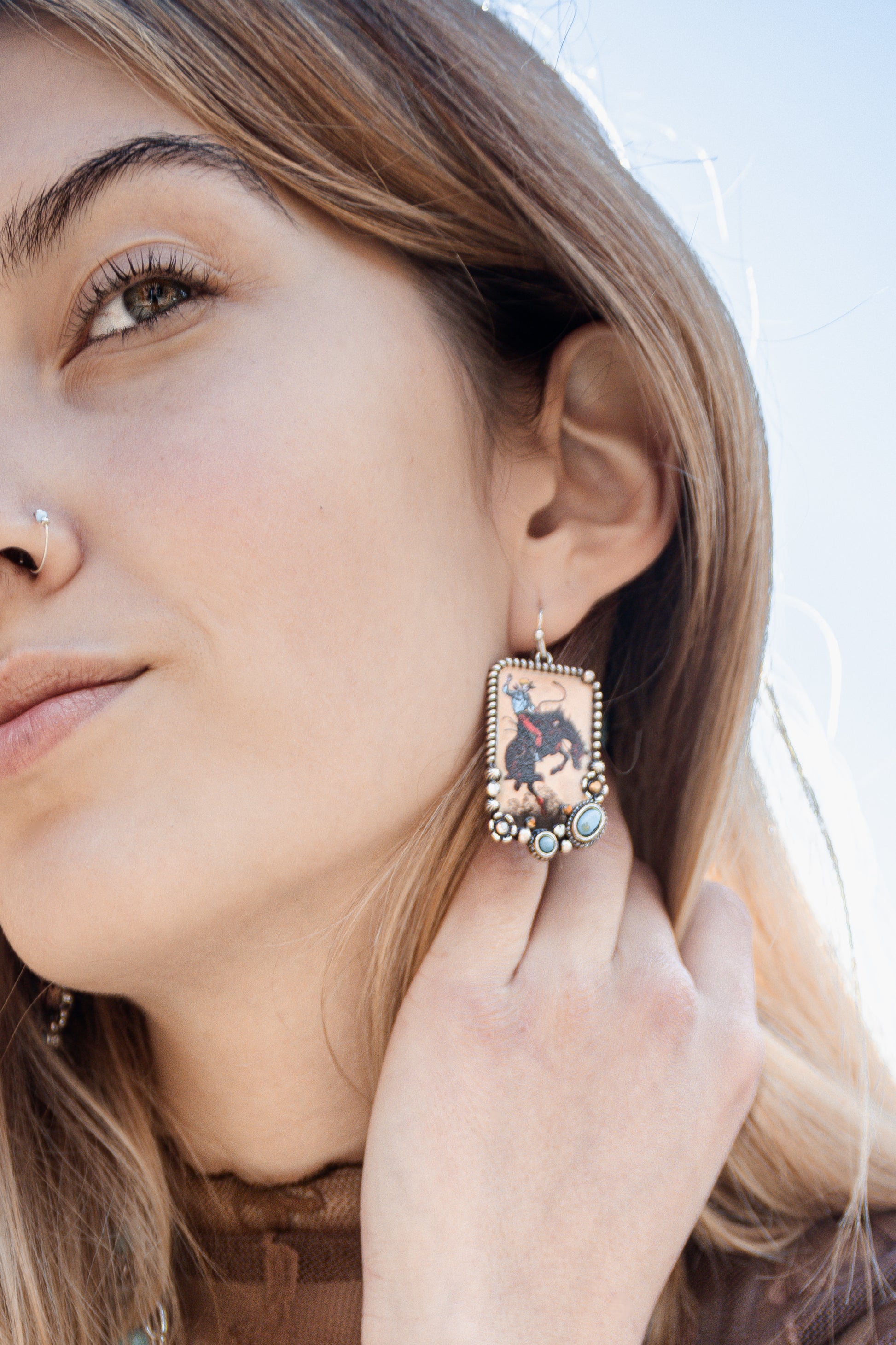 Bring the spirit of the arena wherever you go with The Cowtown Pair. These statement earrings feature a vintage-style cowboy and bronc design, framed in antique silver with intricate floral details and turquoise accents. They capture the grit, grace, and glory of small-town rodeos — where the dust never settles and the stories never fade.