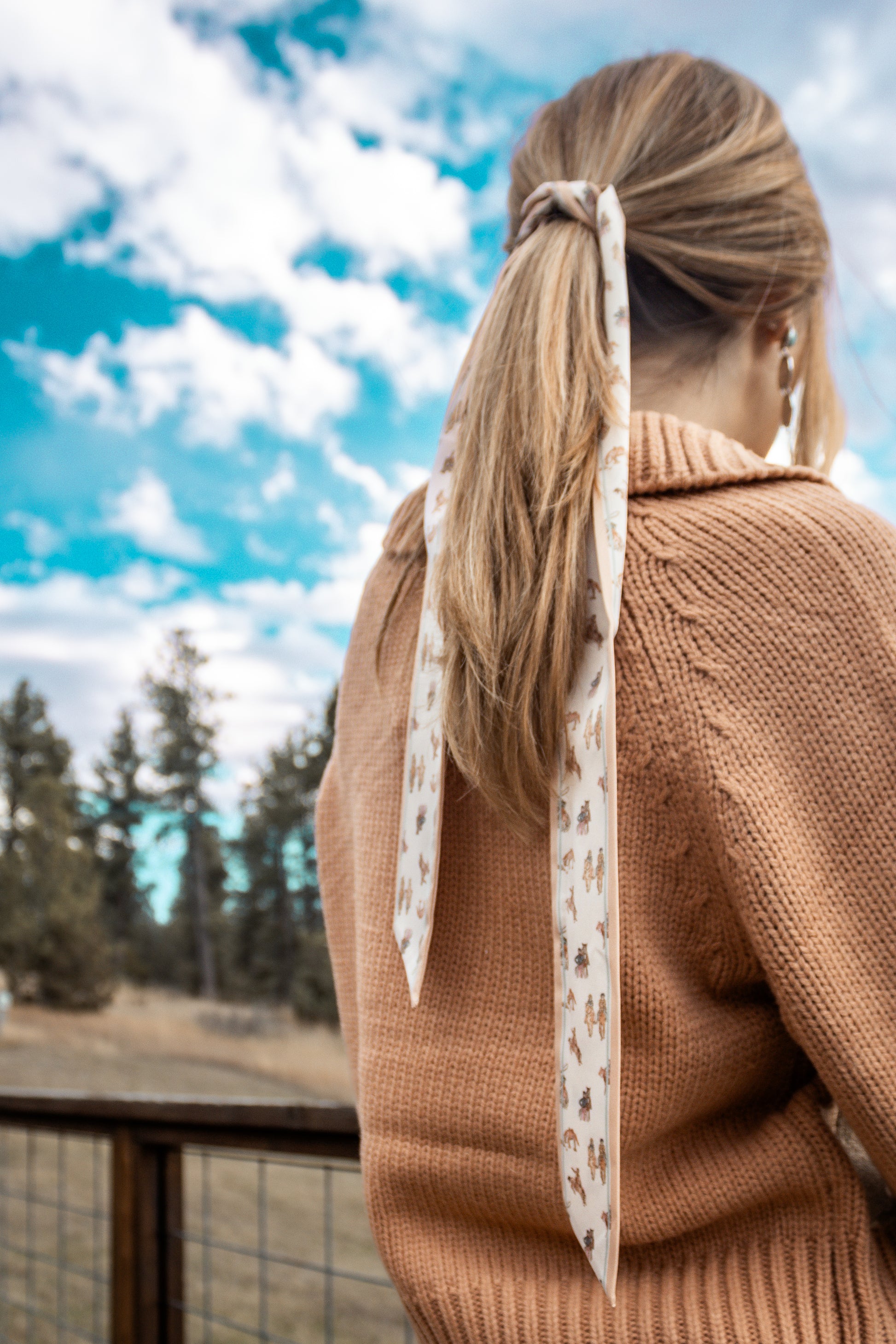 A simple and fun way to dress up any outfit or handbag. This hand drawn silk twilly is designed in Oregon. Blended with polyester, our twillies are resist wrinkles, which make them so versatile and easy to use. These make holiday shopping easy as they can be a stocking stuffer, gift for her, or a small holiday gift this Christmas season.