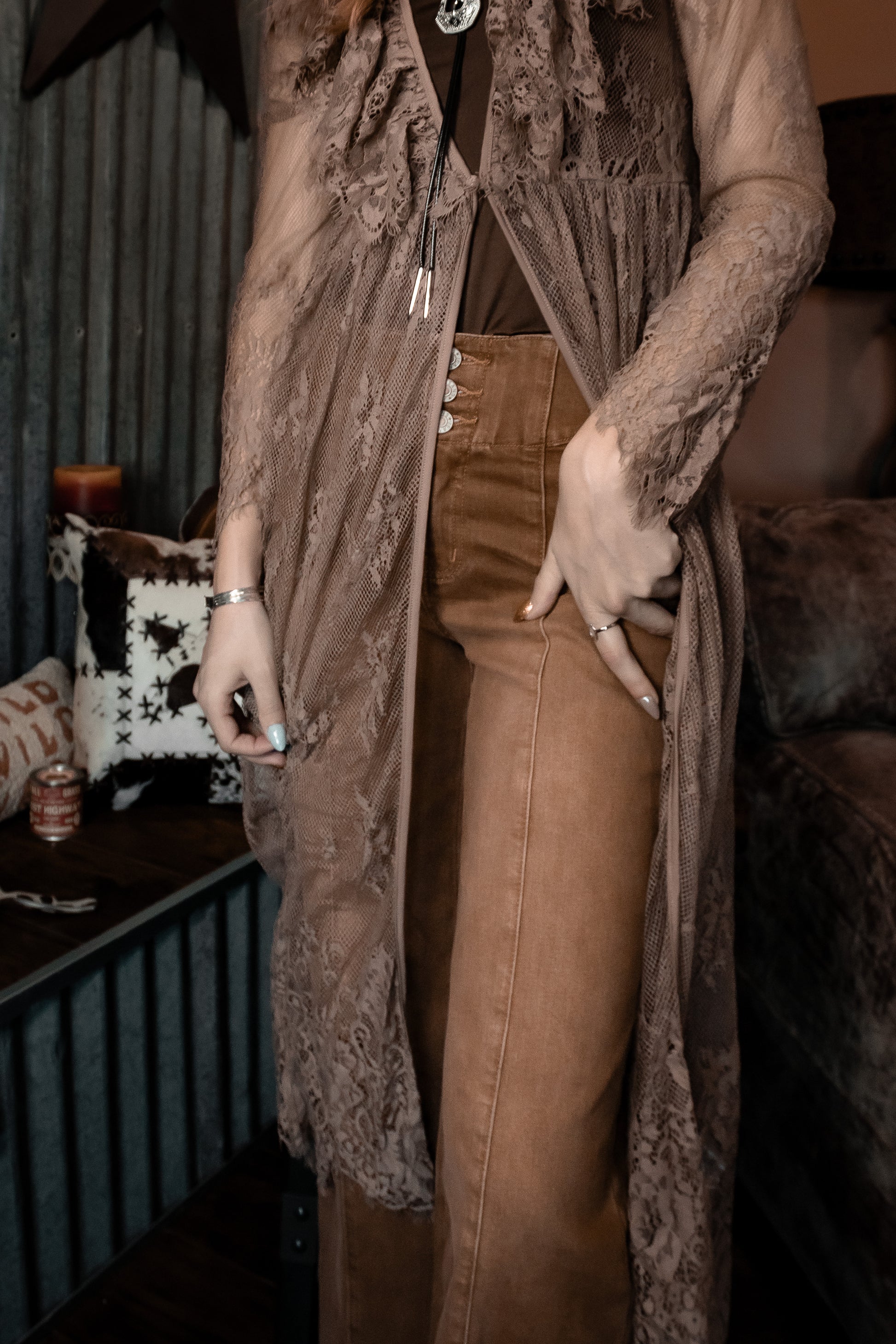 Long sleeve sheer lace top with delicate ruffle detailing along the neckline. Features a tie-front closure and scalloped lace hem for a soft, romantic look.
