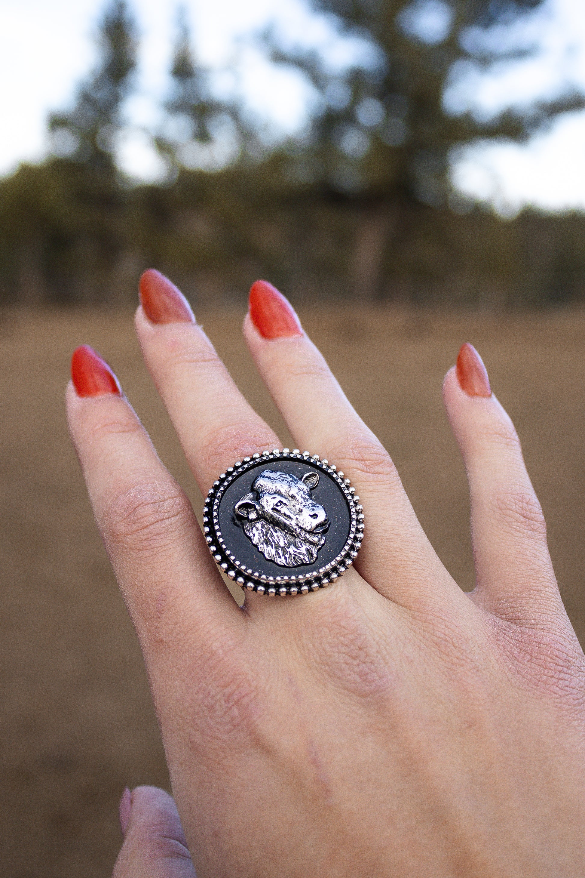 A statement silver-burnished cuff ring featuring an engraved buffalo design. Adjustable and beautifully detailed, this piece celebrates the spirit of the West and makes a standout addition to any jewelry collection.